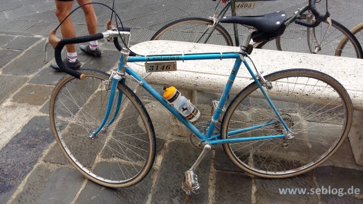 So international wie die Räder war auch das Teilnehmerfeld, wahrscheinlich sogar noch internationaler, denn bei der Eroica Gaiole kommt auch die Masse der Räder ausländischer Teilnehmer aus Italien. In der Mehrzahl sah ich Räder von Bianchi, Masi oder Colnago, und ganz oft von mir unbekannten italienischen Manufakturen – bzw. von Händlern gelabelte. Bei den Komponenten dominierte, wie auch an den Ständen, Campagnolo das Geschehen.